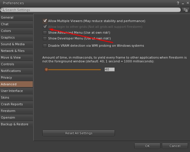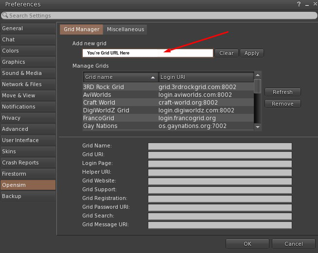 - Se l’opzione "GRID" non appare per selezionare la griglia desiderata, vai nella scheda "Preferences" → "Advanced" e spunta l’opzione "Allow login to other grids", come mostrato sotto, poi torna indietro e ripeti i passi dall’1 al 6